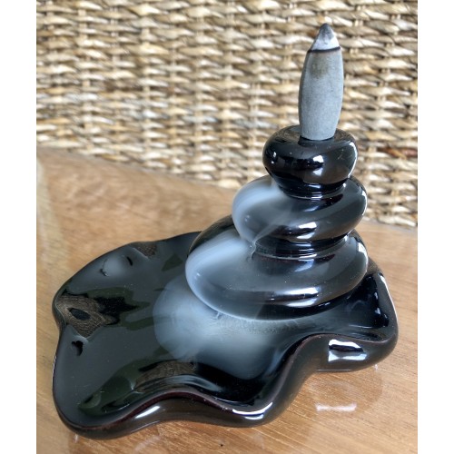 Les Fontaines d'Encens sont spécialement conçues pour créer une cascade de fumée descendante, qui se déverse de façon spectaculaire, créant un effet fascinant et hypnotisant.  Un fois le cône d'encens allumé, la fumée créée sera plus dense que l'air environnant, permettant une chute en cascade impressionnante qui se glissera dans tous les recoins prévus à cet effet.